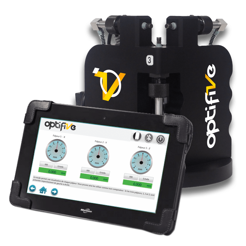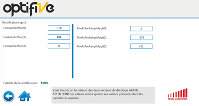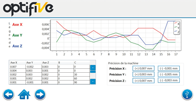 Doté de 3 capteurs reliés à une interface tactile, le logiciel Optifive permet de connaître la précision de la machine et de calculer les nouveaux paramètres du point pivot (TCP, RTCP, TRAORI…)